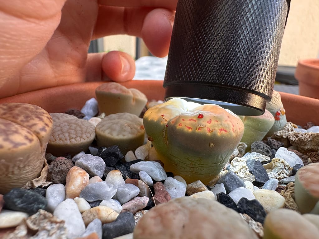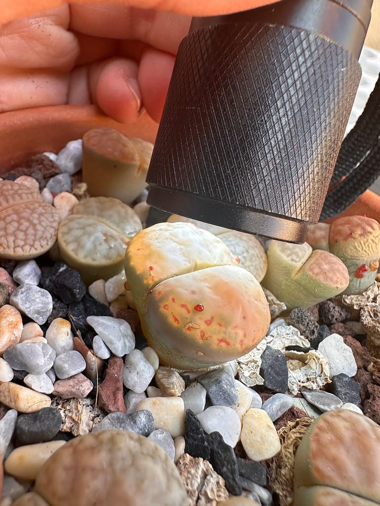 Esta explicación «tiene lógica», el único fallo de nuestro razonamiento es que, si esto fuera correcto, también mis Lithops deberían sudar y producir gotas rojas y eso yo no lo he visto jamás y, hasta la fecha, no sabía de nadie a quien le haya sucedido. Tampoco lo he leído en ningún sitio.